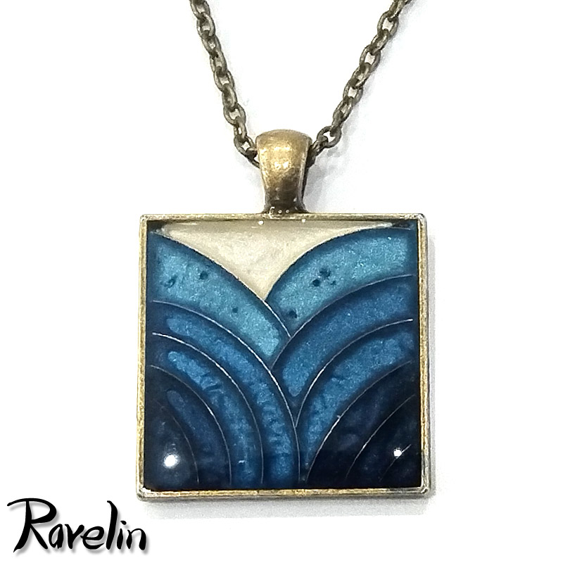 Dekoracja medalionu została wykonana z ustawionych "na sztorc" kawałków sprężyn od zegarków. Powstałe w ten sposób pola wypełniam różnymi kolorami. Całość zabezpieczyłem żywicą epoksydową.