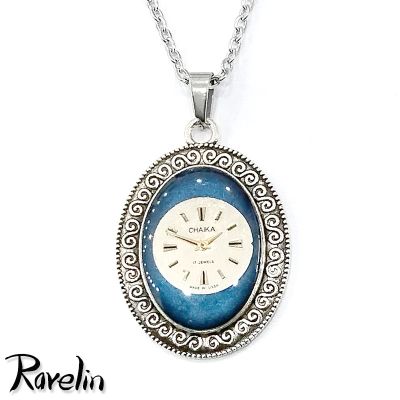 Dekoracja medalionu została wykonana z tarczy od zegarka na niebieskim tle. Całość zabezpieczyłem żywicą epoksydową.