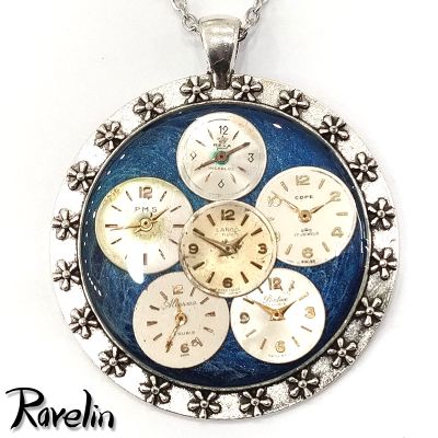 Dekoracja medalionu została wykonana z tarcz od zegarków na tle kolorowej farby. Całość zabezpieczyłem żywicą epoksydową.