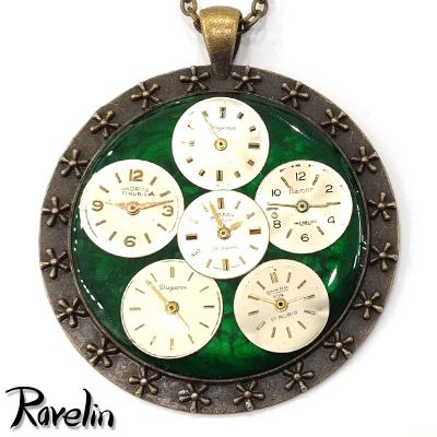 Dekoracja medalionu została wykonana z tarcz od zegarków na tle kolorowej farby. Całość zabezpieczyłem żywicą epoksydową.